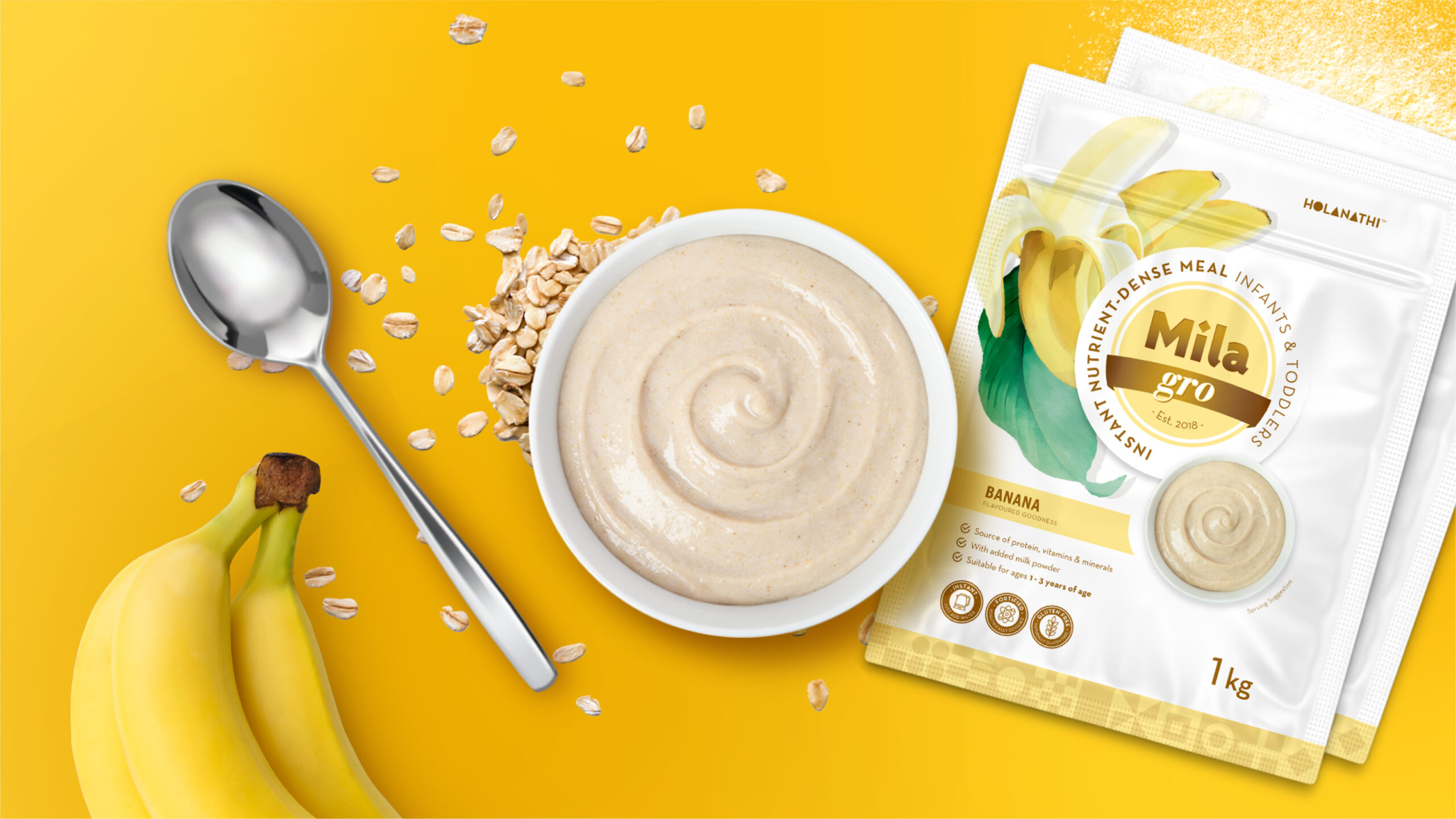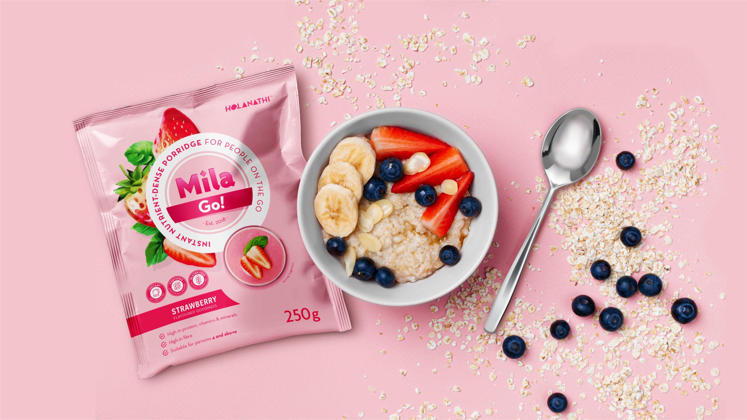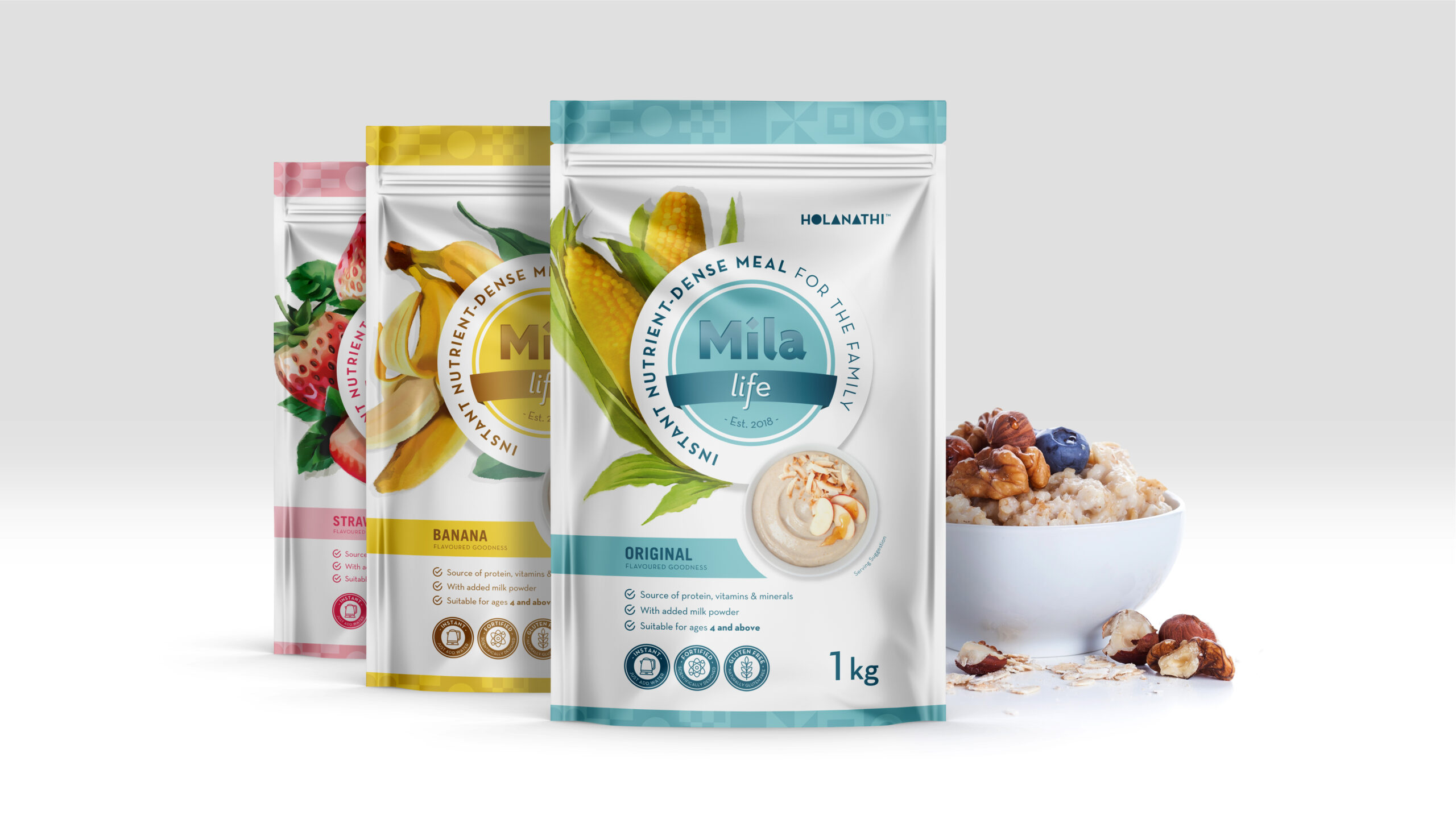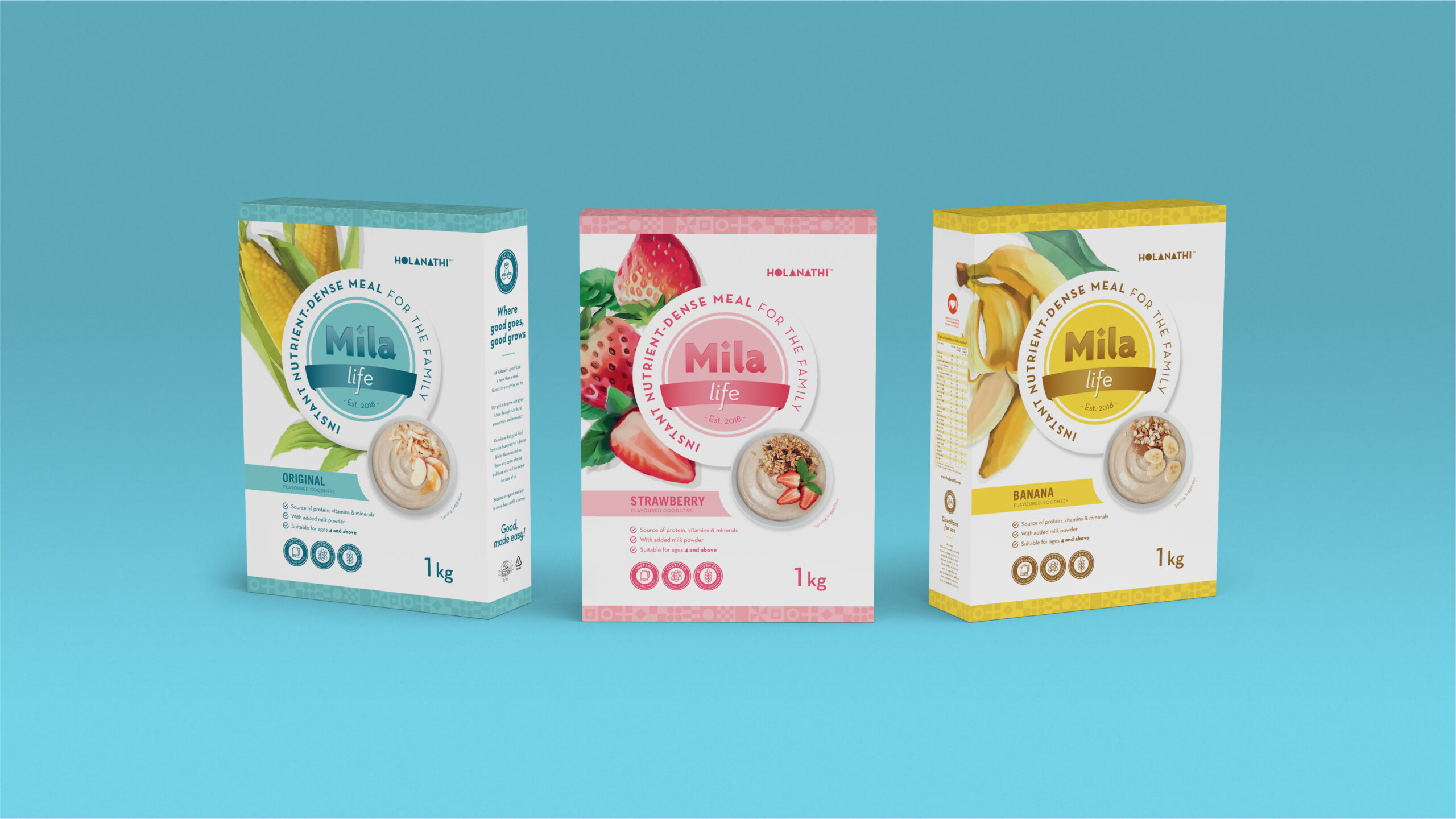 Mila (meaning “grow” in Zulu, and “to thrive” from the Xhosa “Ukumila”) is a nutrient dense meal created by Holanathi. The scientifically formulated meal is not only good to eat, but every pack sold contributes to feeding someone in need. A fresh, clean visual language was developed across 3 SKU’s in 3 flavours. Bespoke illustrations were created and product shots taken to bring the brand to life.